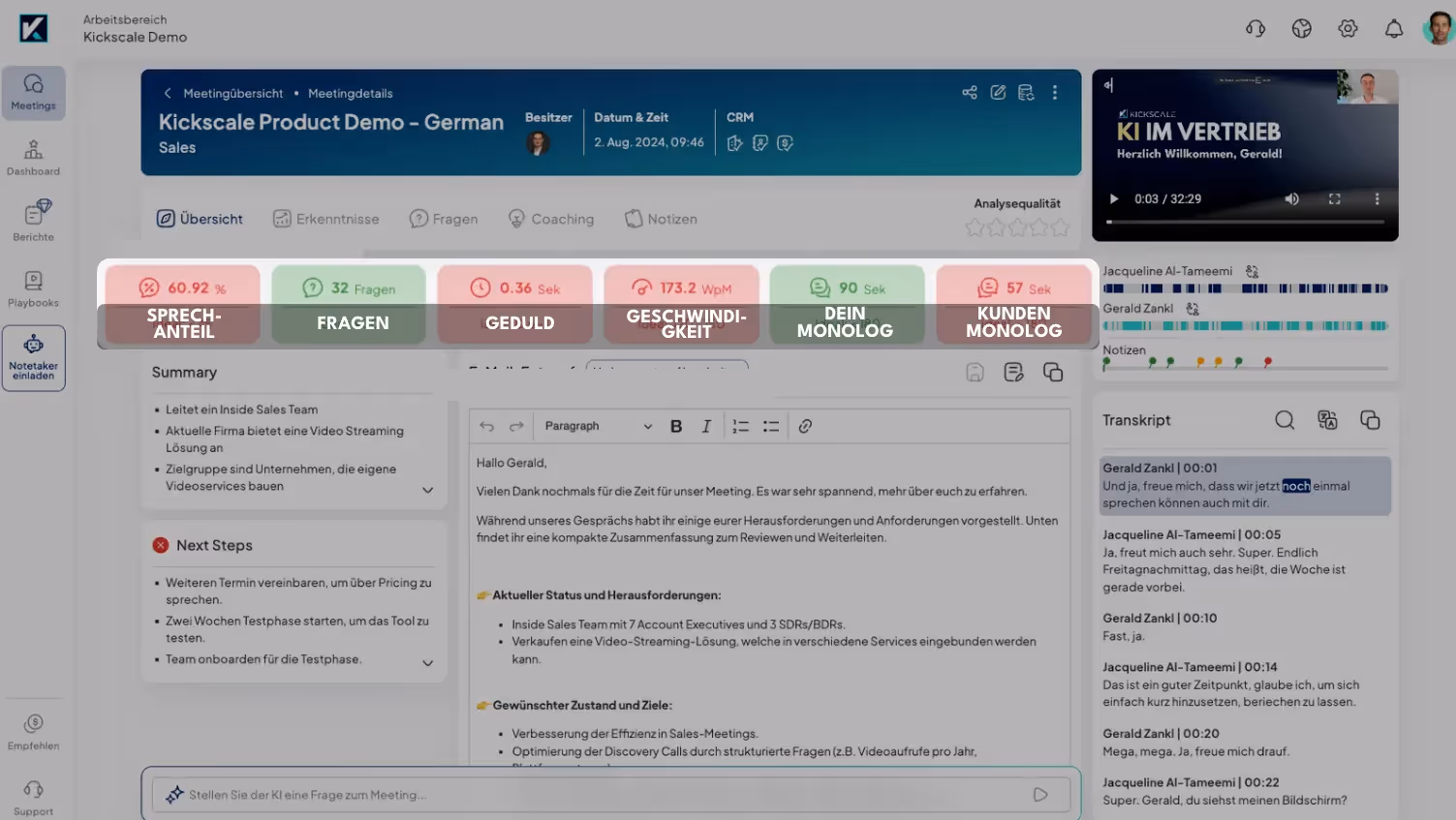 Wenn Sie messen möchten, wie Sie in Verkaufsgesprächen abschneiden, laden Sie Ihre Verkaufsgespräche kostenlos auf app.kickscale.com hoch.